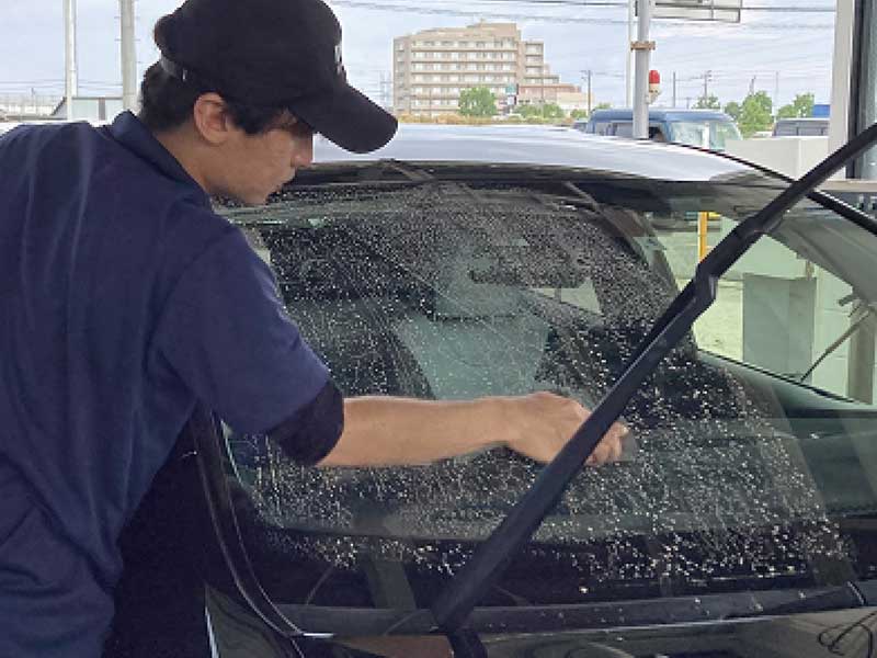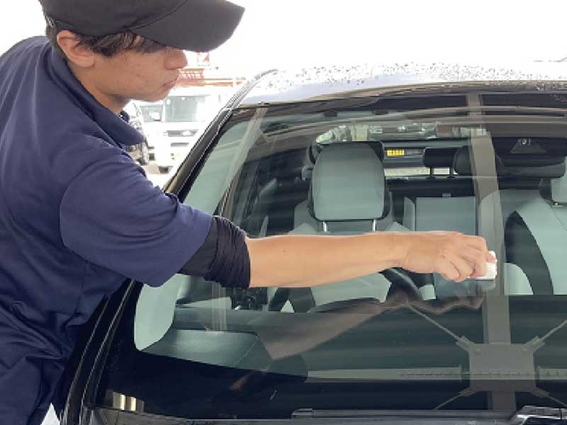 走行中に視界を遮るギラギラの油膜を特殊なケミカルでスッキリ除去します。